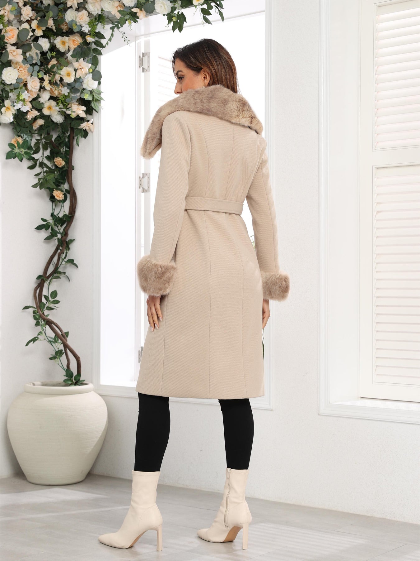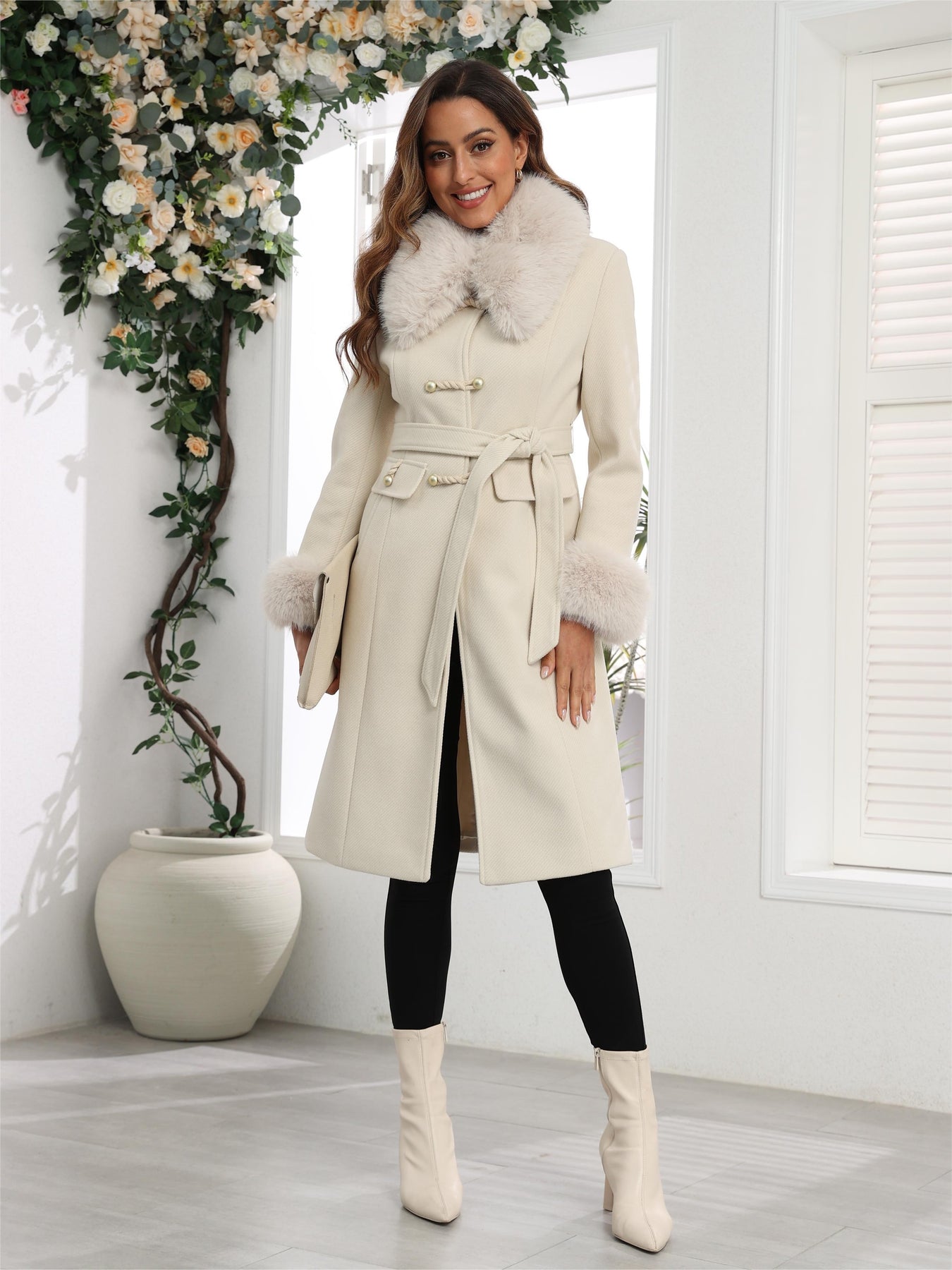 Made with a smooth, beautifully structured fabric and finished with a detachable faux fur collar, Evelyna offers versatility without losing its graceful charm. The long, tailored silhouette flatters your shape while giving room to layer comfortably. Thoughtful details like clean button closures and a waist-accenting belt create a polished look that suits both casual outings and special occasions.